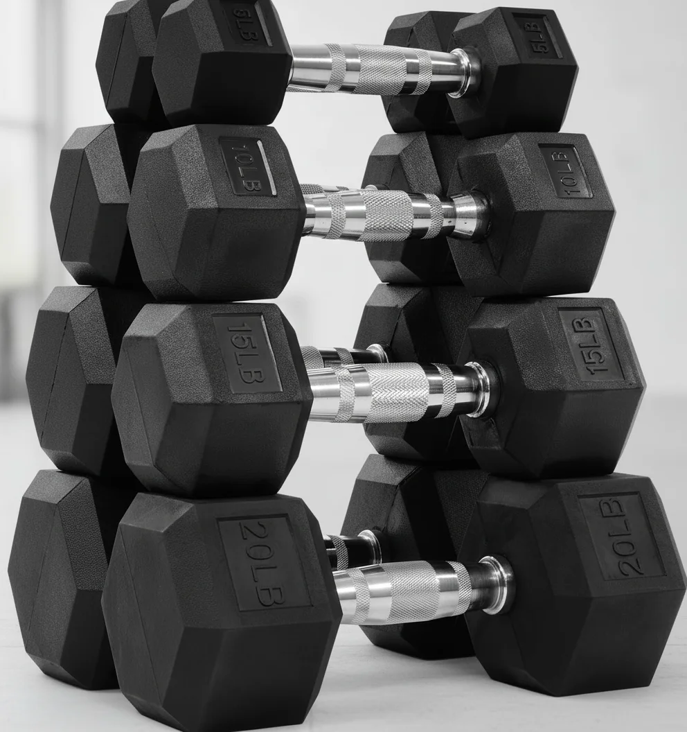 Transform your fitness journey with our premium hex rubber dumbbell set! Engineered for maximum performance and durability, these versatile weights are your perfect partner for achieving your health and fitness goals. **Why Choose Our Hex Dumbbell Set?** • **Superior Construction**: Each dumbbell features solid cast iron cores encased in high-quality rubber, connected by durable cold-rolled steel chrome handles. This robust design ensures long-lasting performance and resistance to wear and tear. • **Innovative Hex Design**: Say goodbye to rolling dumbbells! The unique hexagonal shape provides stability during exercises and allows for convenient, space-saving storage. No more chasing weights around your workout space! • **Ergonomic Comfort**: The textured contoured handle offers exceptional grip and comfort, reducing hand fatigue during intense training sessions. Experience secure handling whether you're doing heavy lifts or high-rep exercises. **Complete Full-Body Transformation** Unleash your potential with endless exercise possibilities! These dumbbells are perfect for: • Upper body development: bicep curls, shoulder presses, chest flies • Lower body strengthening: squats, lunges, deadlifts • Core activation: weighted crunches, Russian twists, wood chops • Functional training: combining multiple muscle groups for comprehensive workouts **Versatile For Every Fitness Level** Whether you're just starting your fitness journey or you're an experienced athlete, our dumbbell set grows with you. Available in multiple weight options (60LB, 100LB, 150LB, 550LB sets), you can choose the perfect resistance level for your current ability and future progress. **Multiple Usage Environments** Take your workout anywhere! These compact yet powerful dumbbells are ideal for: • Home gym setups - perfect for limited spaces • Commercial gyms - built to withstand heavy use • Outdoor training sessions - weather-resistant construction • Travel workouts - easily transportable for consistent training **Achieve Your Fitness Goals** Experience remarkable benefits including: • Effective muscle toning and definition • Significant strength building and power development • Enhanced calorie burning and metabolism boost • Improved overall physique shaping • Comprehensive muscle group targeting (arms, chest, back, core, legs) The path to a stronger, healthier you starts here. Imagine the confidence of lifting heavier, the satisfaction of seeing muscle definition emerge, and the energy that comes from regular strength training. Thousands of fitness enthusiasts have transformed their bodies with quality equipment - now it's your turn! Ready to build the body you've always wanted? Add this essential dumbbell set to your cart today and take the first step toward your fitness transformation. Your future stronger self is waiting!